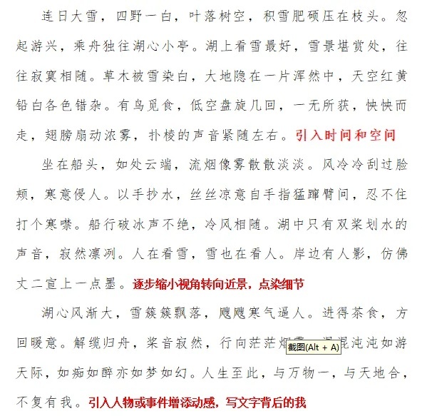 在写景造境的基础上,可以适时引入人物或对话、事件,使文章的结构层次更为丰富,让原本以景为主的水墨画多一个鲜明的“人”,让静态的结构增加了动态元素,也让抽象的意境变得具体,从水墨画转为人物画。