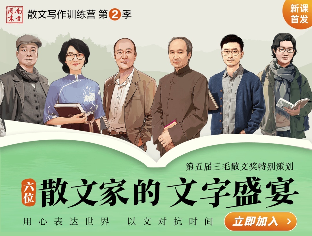 如果你也想从心出发,用散文书写自己在这个世间的生命痕迹,不妨加入我们。我们特邀刘亮程、蒋蓝、胡竹峰、沈念、苏沧桑、江子,6位创作经验20年以上的国内当代非常优秀的散文家,花费半年打磨出《南方周末散文写作训练营第二季|六位散文家的文字盛宴》课程。