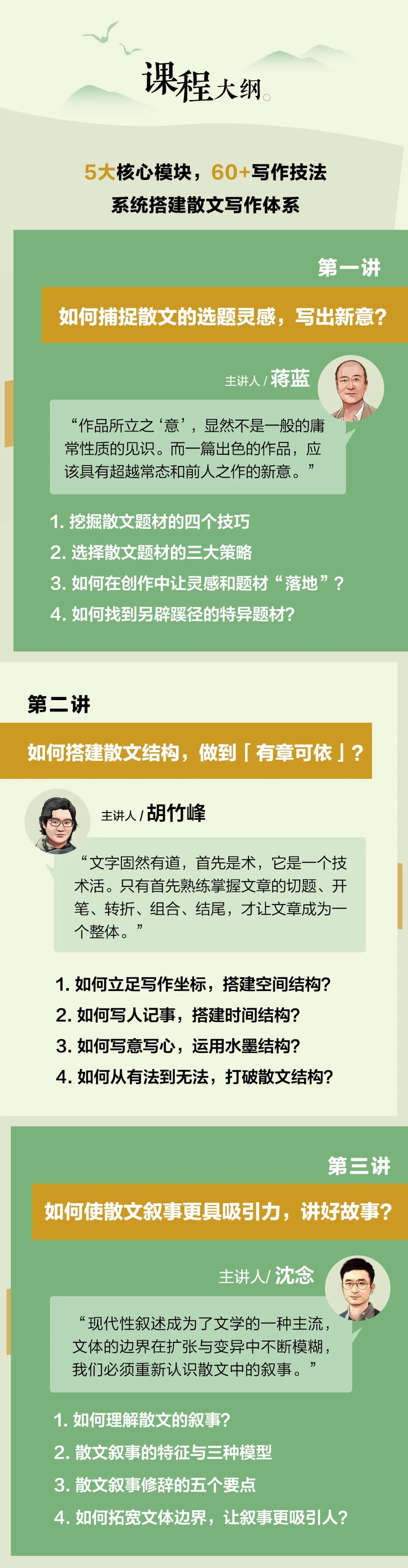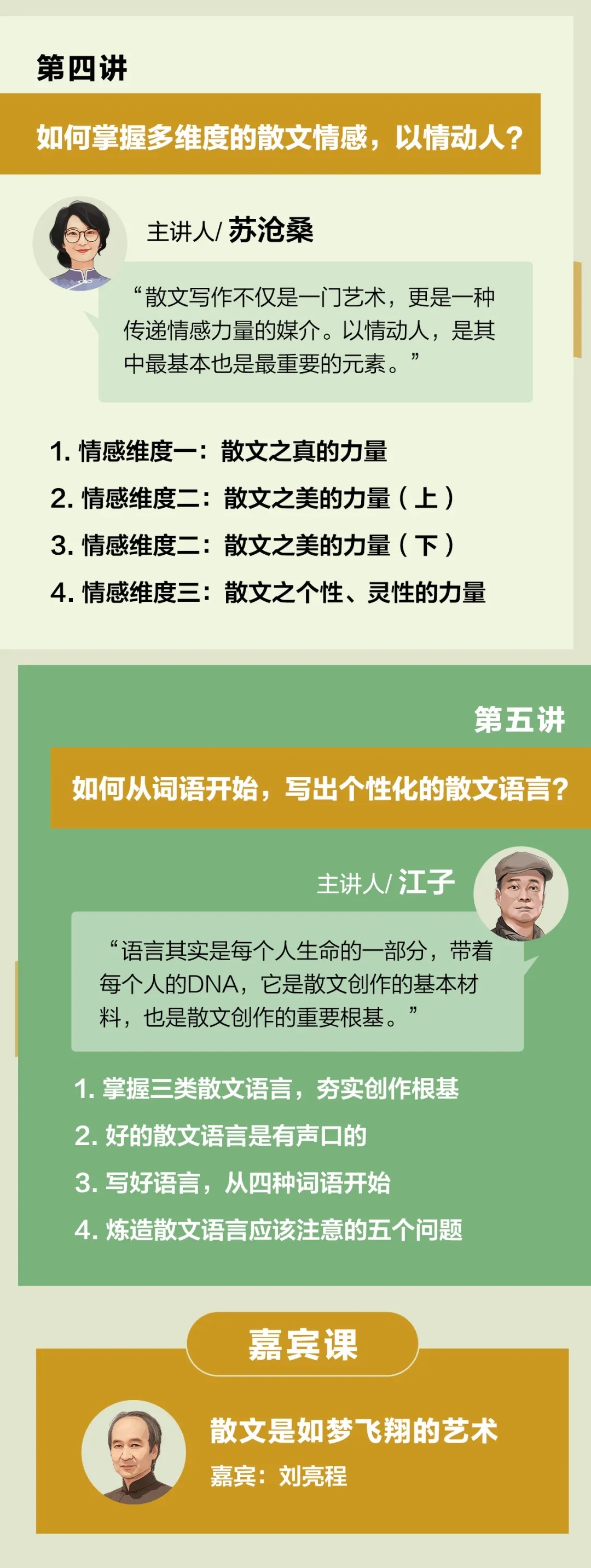 本次课程涵盖5大模块,选材、结构、情感、语言、叙事。在这里,你不仅能听到他们前沿的散文观,还能学到不同风格的散文家的写作技巧。