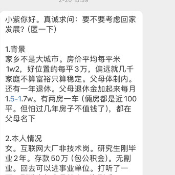 【小紫你好崇左股票配资。真诚求问:要不要考虑回家发展?(匿一下)